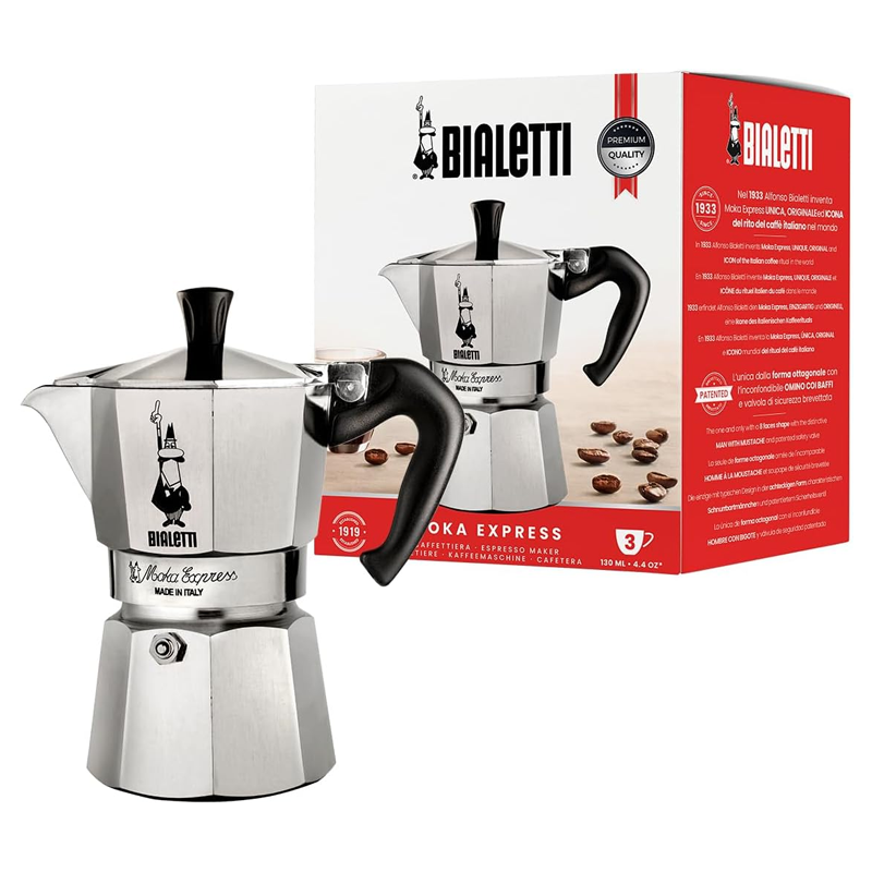 Moka Express is the world’s number one coffee-maker and has been manufactured in over 200 million units. For an excellent cup of Italian coffee, Bialetti Moka Express is the classic household coffee-pot and the only one to bear the unique mark of the “little fellow with the moustache”.
