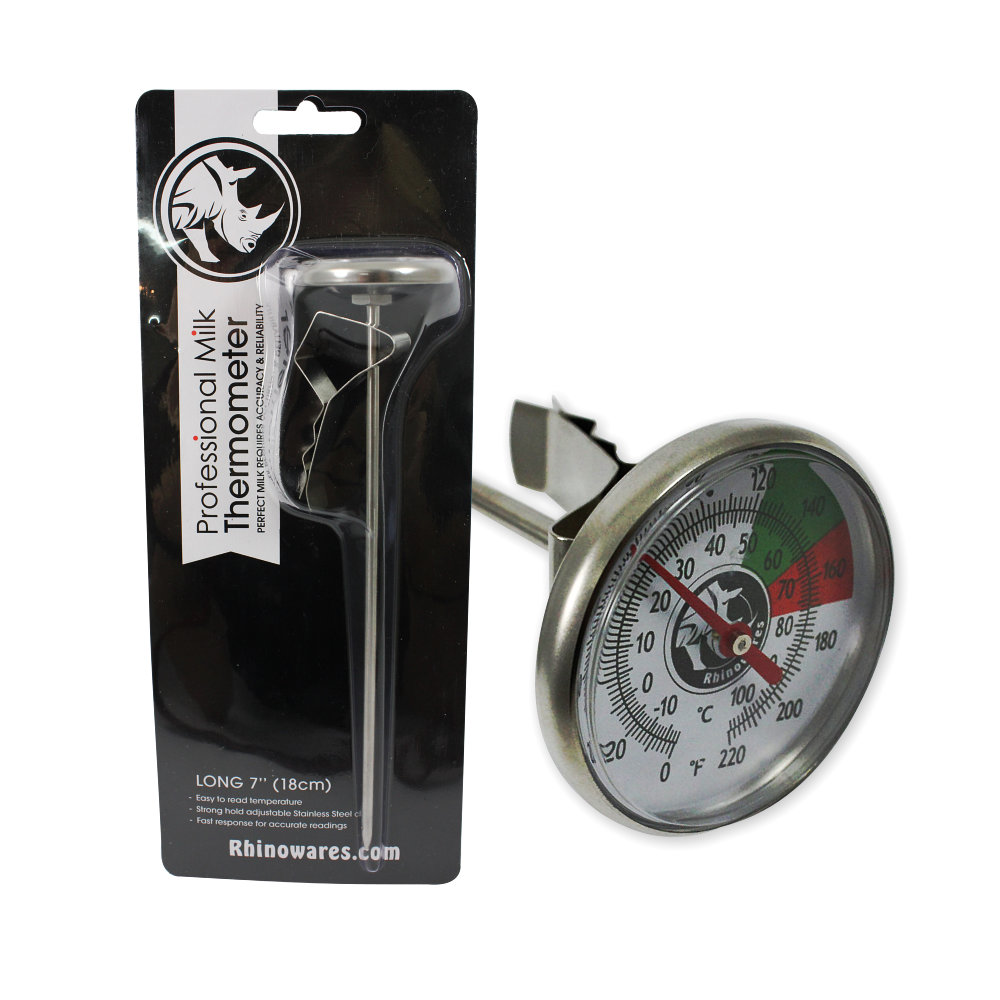 The Rhinowares Accutemp Stick On Thermometers are designed to stick to your milk jugs and gauge temperatures as you heat the milk, for precisely heated milk in every coffee.