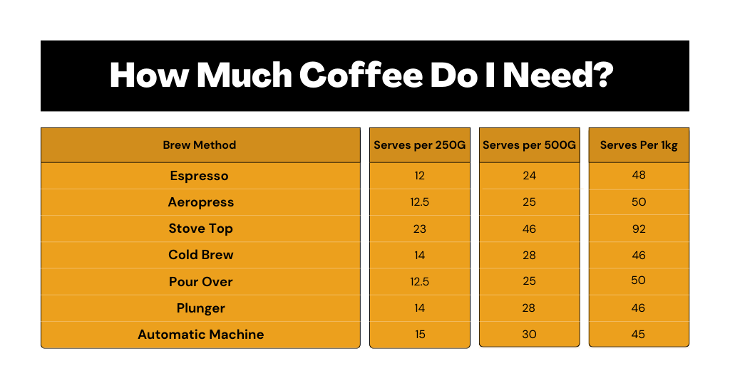 We offer different bag sizes, 250g, 500g, and 1kg. See the table below for a reference of average serves according to the brew method.